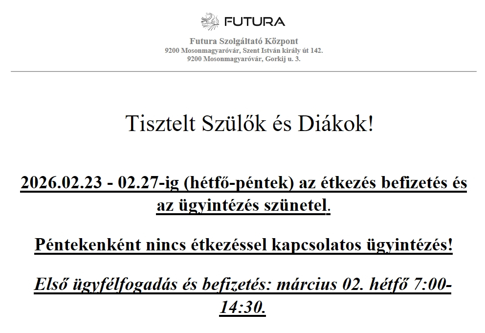 Tájékoztatjuk a Tisztelt Szülőket és a Diákokat, hogy Mosonmagyaróvár Város Önkormányzata 2026. január 1-től az étkezési díj emeléséről döntött.